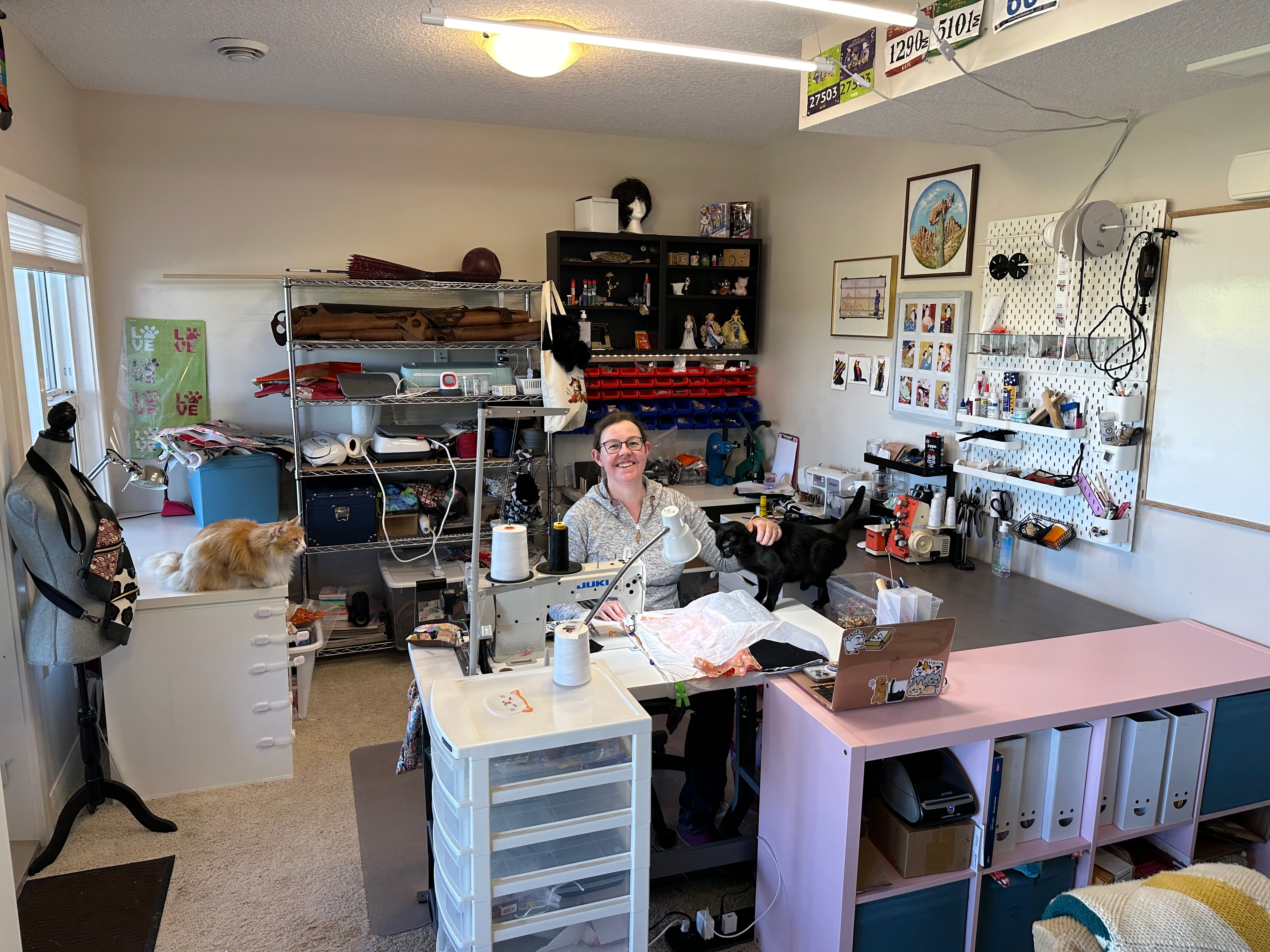 Atelier Nekozuki uses hand-selected Japanese fabrics from Kyoto and Tokyo, Japan. Katie purchases fabric from these two cities and then returns to her studio in the foothills of the Canadian Rockies and crafts the bags with care and quality control inspectors' (the cats') approval).