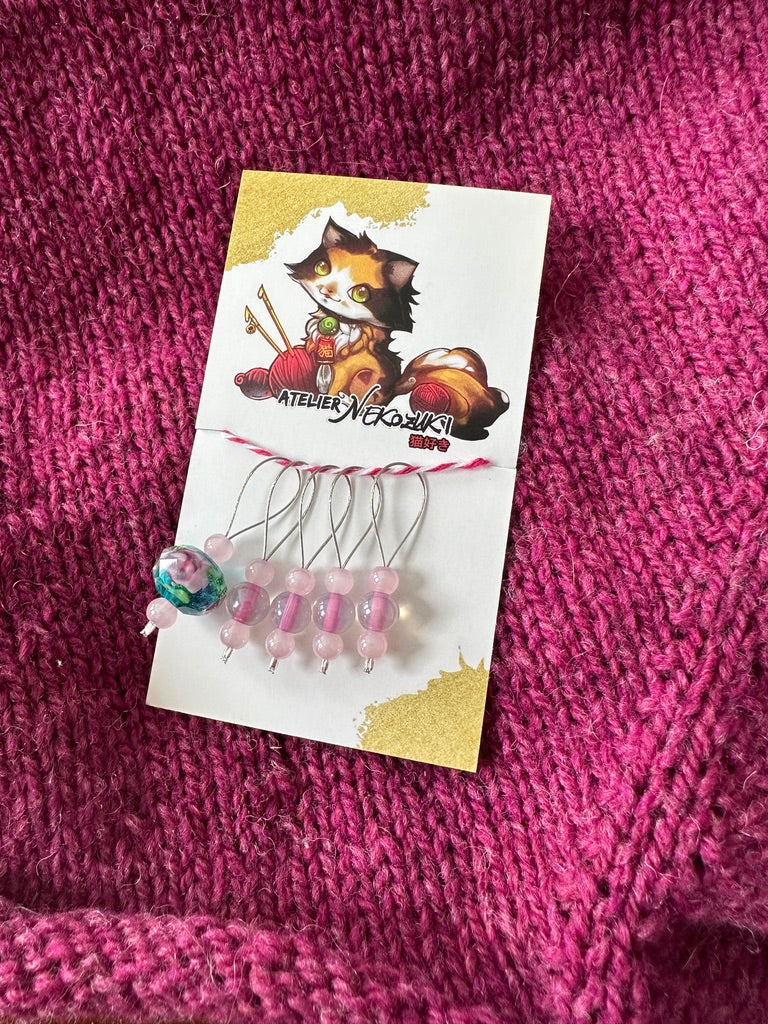 Hand beaded stitch markers made from various materials, mainly glass beads