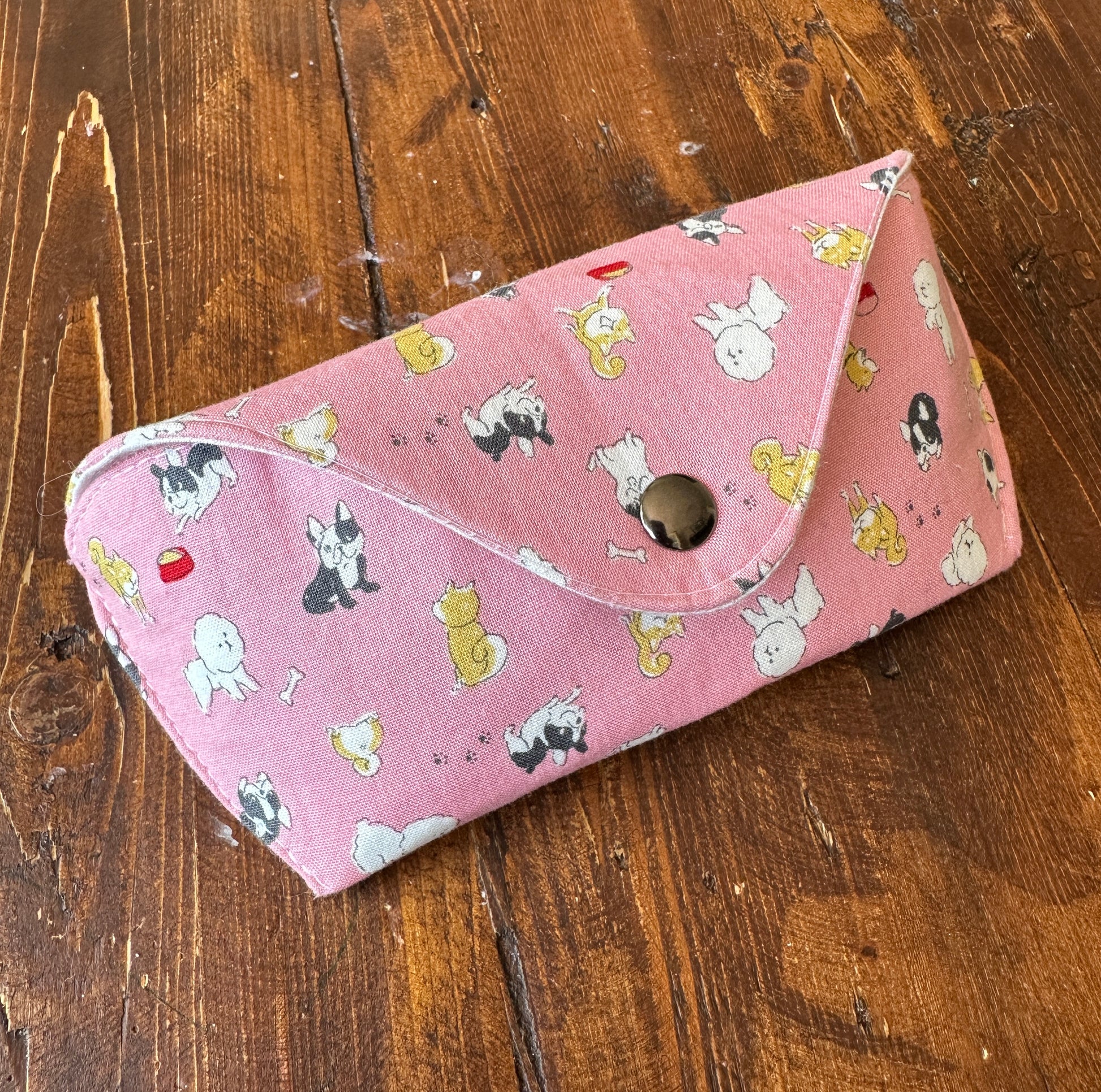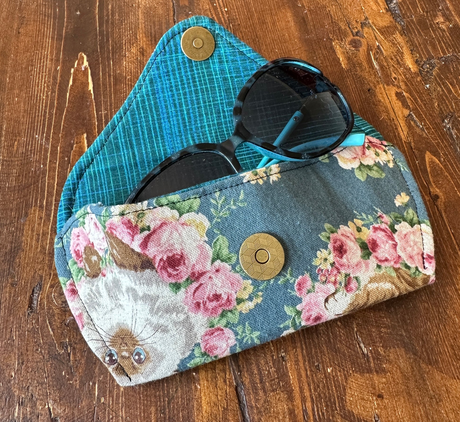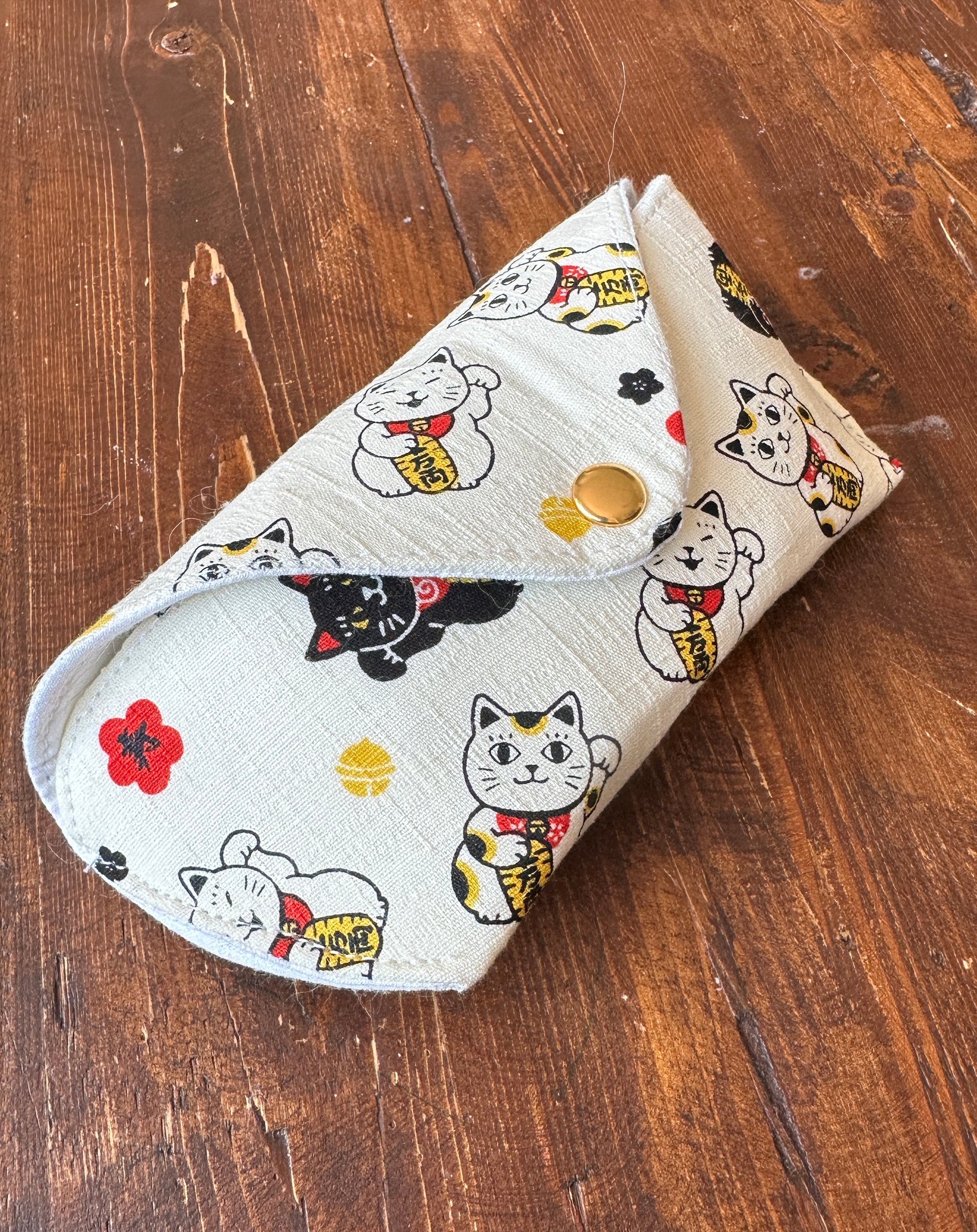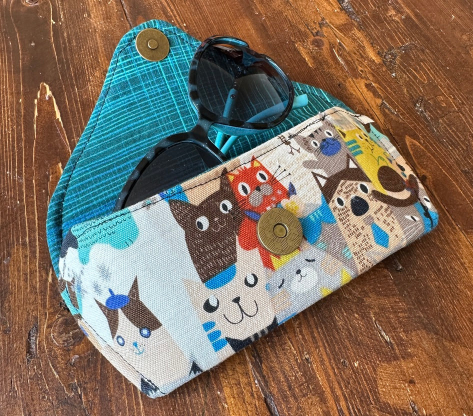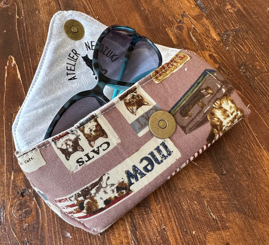 Crafted from exquisite Japanese fabric, this hand-sewn glasses case offers exceptional protection for your eyewear. Designed with a fully padded interior and lined with luxurious quilting cotton, it features a convenient magnetic snap closure. Effortlessly stylish and functional, it fits most sun/eye glasses.