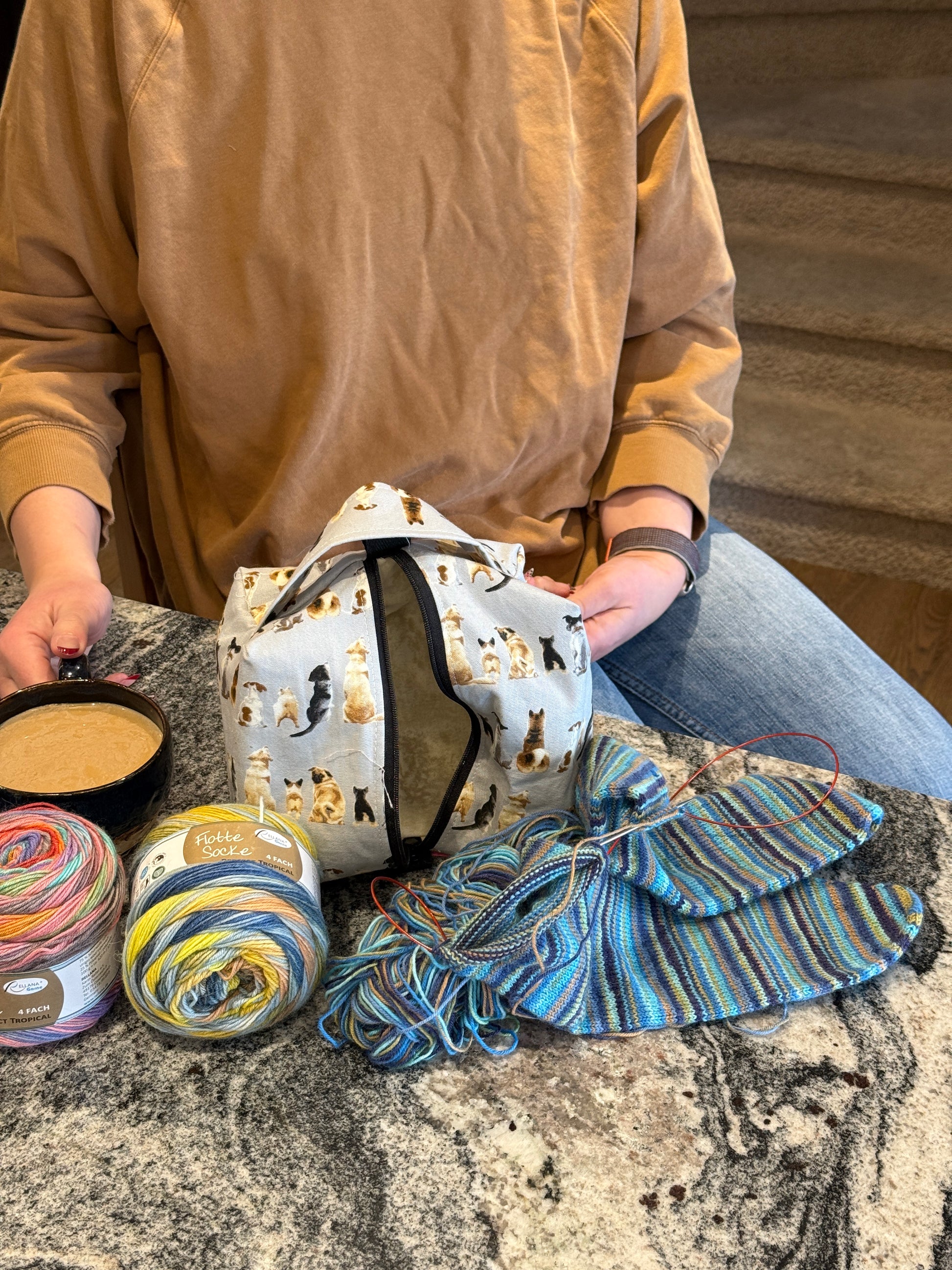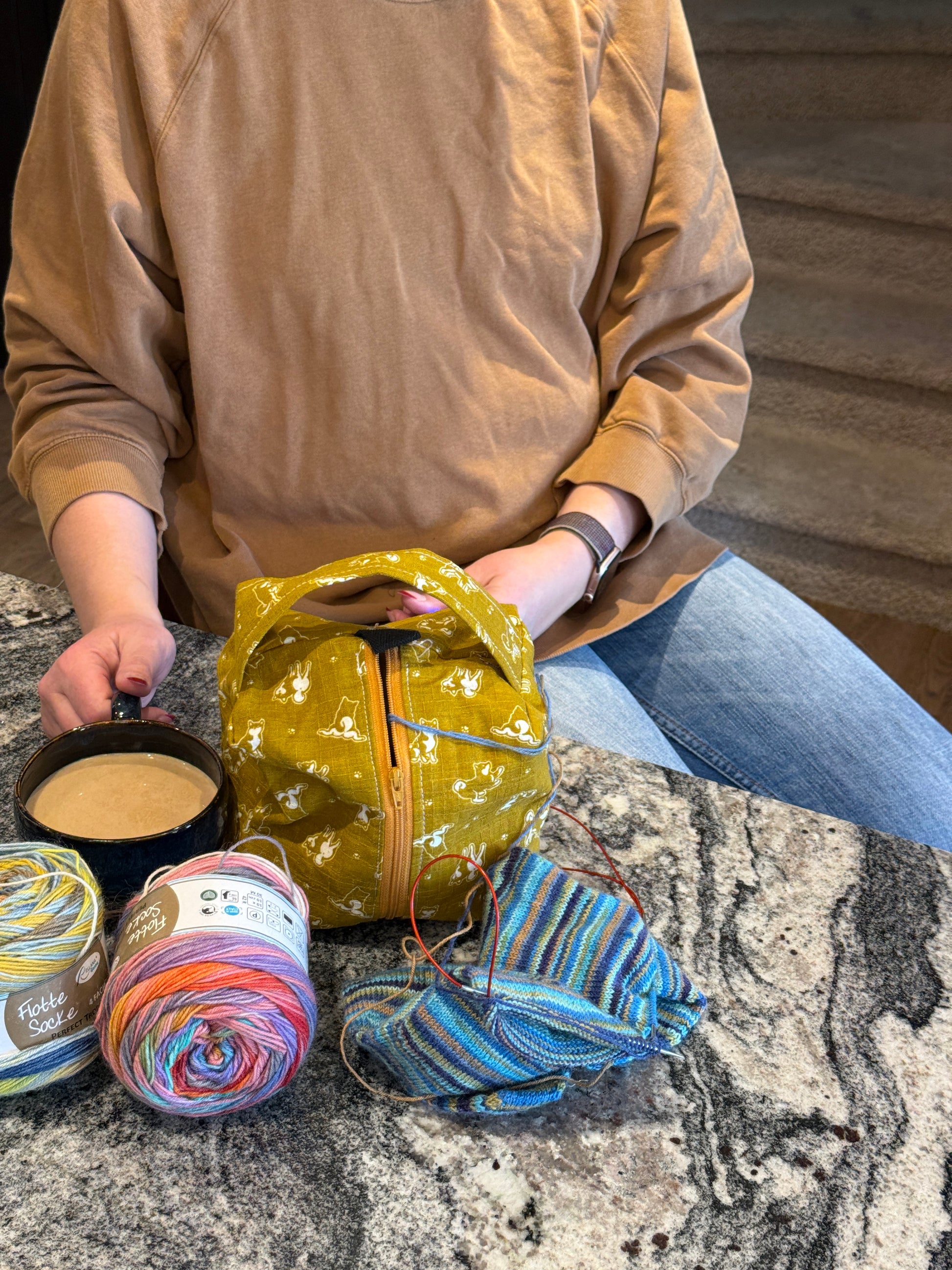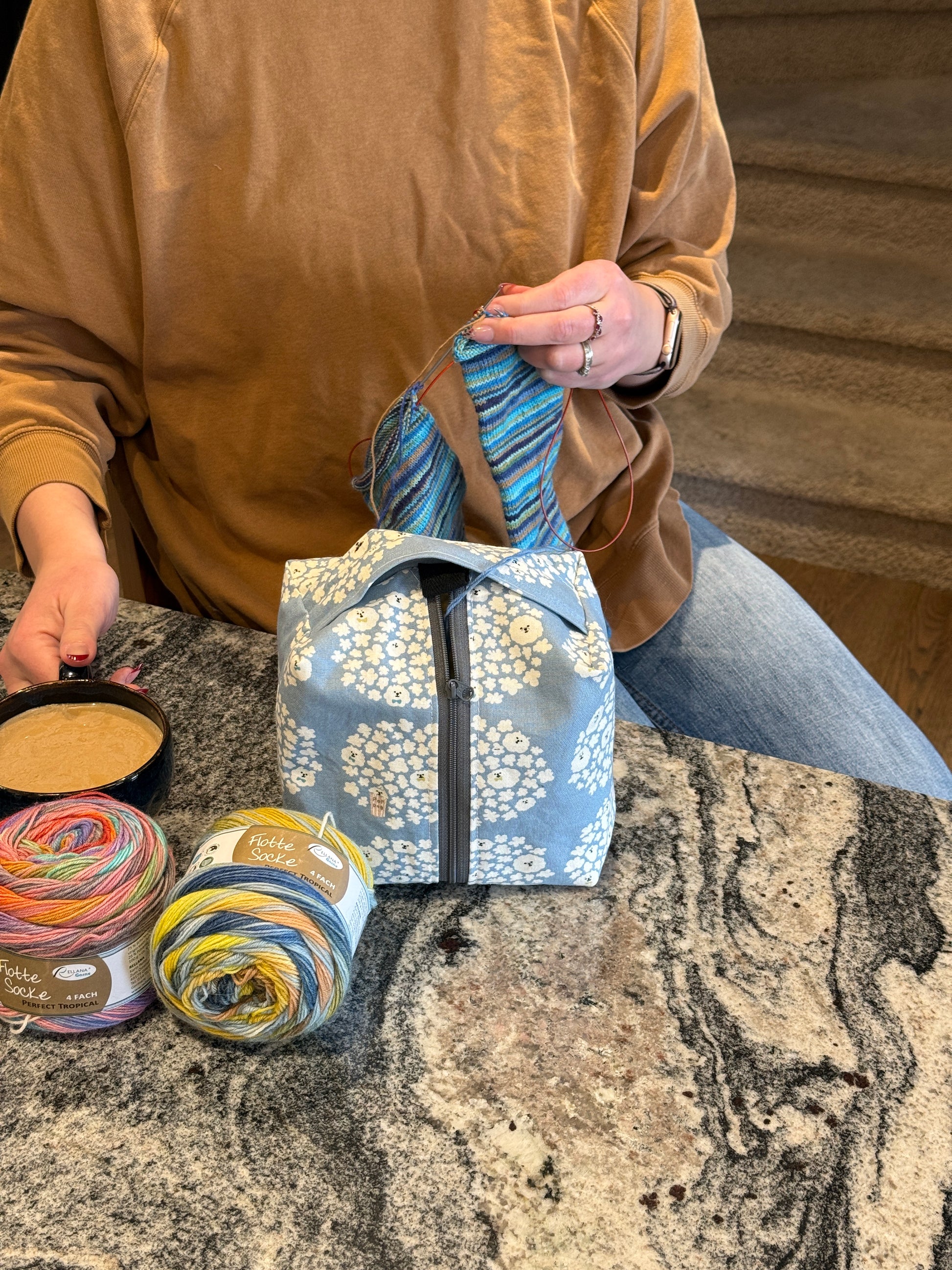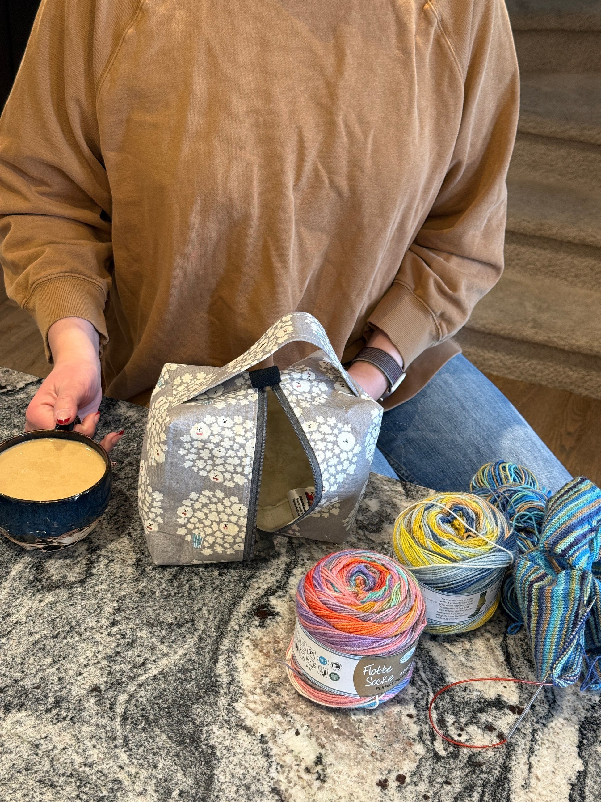 I pride myself on making all my bag styles transportable, so you can carry your knitting everywhere with you! Whether it’s a strap wrist, shoulder straps, or carabiner hook, I’ve got you covered!